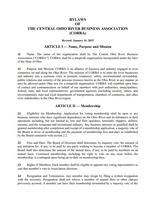 The Central Ohio River Business Association (CORBA) operates as a nonprofit organization uniting businesses and partners that depend on the Ohio River and its tributaries. Governed by a volunteer Board of Directors, CORBA’s bylaws outline the structure of membership, leadership, and meetings that guide the Association’s mission to promote river commerce, safety, environmental stewardship, and regional economic growth. The bylaws ensure transparency, collaboration, and accountability as CORBA works to strengthen the Central Ohio River community.